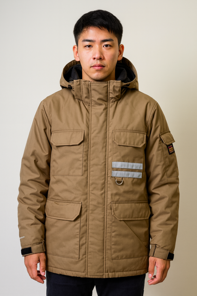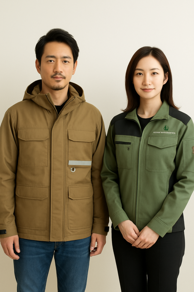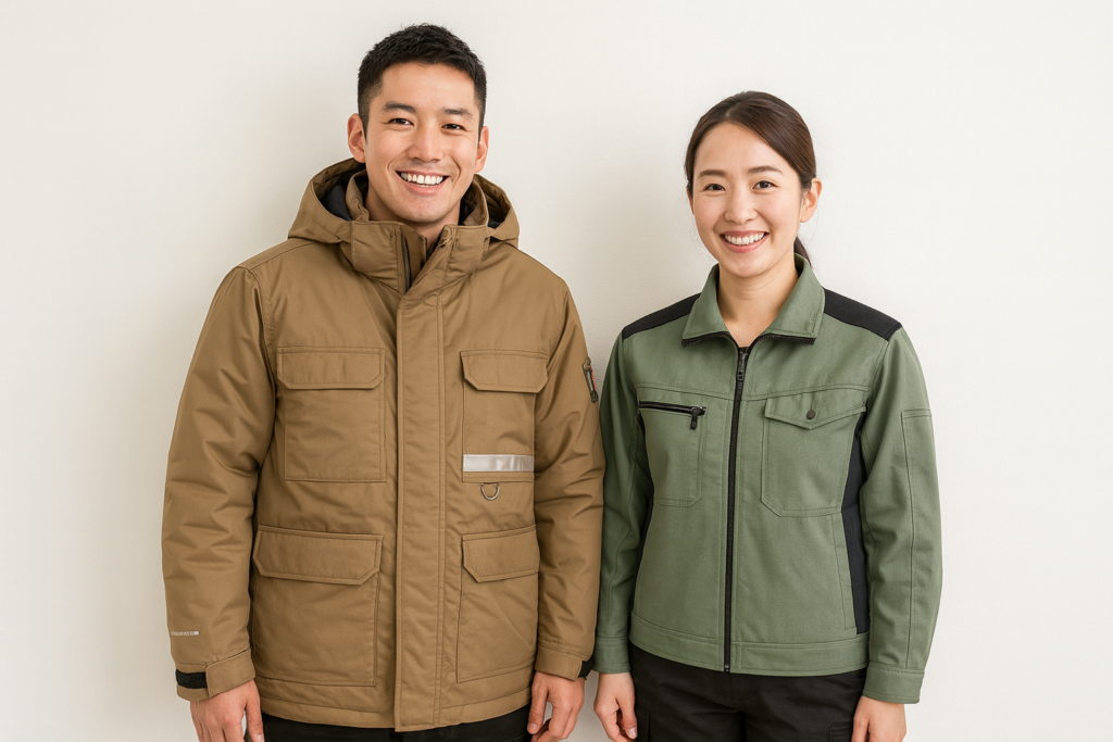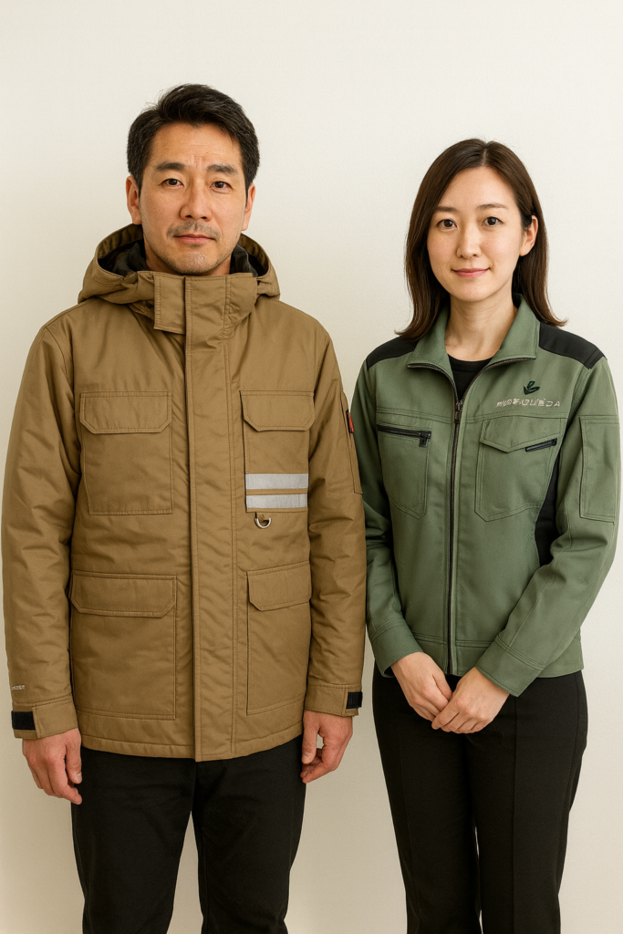 “この写真を使って画像を作って欲しいんだ。左のジャケットは、男性が着用している画像。右のジャケットは女性が着用している画像。どちらのジャケットも忠実に再現してほしいね。男性の人物像は、30代前半の若々しい感じで、身長175cmくらい。ヘアスタイルは短め。女性の人物像は、30代前半で身長160cmくらい。ヘアスタイルは、後ろでまとめている感じ。男性・女性ともに黒のカーゴパンツを履いている感じにしてほしいね。男性と女性は寄った感じで、表情はにこやかに、目線は正面ね。それから、画像は横長で作成してもらえるかな?”
